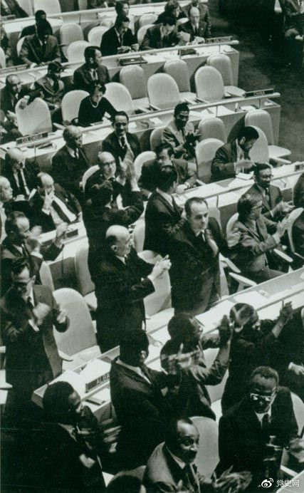 10月25日 第二十六屆聯(lián)合國(guó)大會(huì)以壓倒性多數(shù)的票數(shù)通過(guò)2758號(hào)決議,恢復(fù)中華人民共和國(guó)在聯(lián)合國(guó)的一切合法權(quán)利,并立即把蔣介石集團(tuán)的“代表”從聯(lián)合國(guó)及其所屬一切機(jī)構(gòu)中驅(qū)逐出去。11月15日,中華人民共和國(guó)代表團(tuán)首次出席聯(lián)合國(guó)大會(huì)。